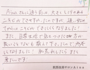 ●今までずっと悩まされていた、ニキビや赤み、大きく改善することが出来ました! こんにちは^^ 横浜で、ニキビ専門サロンを開いている益子です。 何度も繰り返しできる、お顔のニキビ・ニキビ跡などのお悩みに特化した、フェイシャルサロンです。 ずっ …